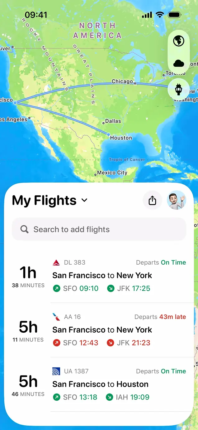 Whether you fly one time per year or one hundred, Flighty gives you a record of all the fun details about your flights. How many times have you traveled around the Earth? What was your worst delay? What's your most-flown plane? Sit back and enjoy your lifetime of flying history, all on an Apple Design Award-winning interface.