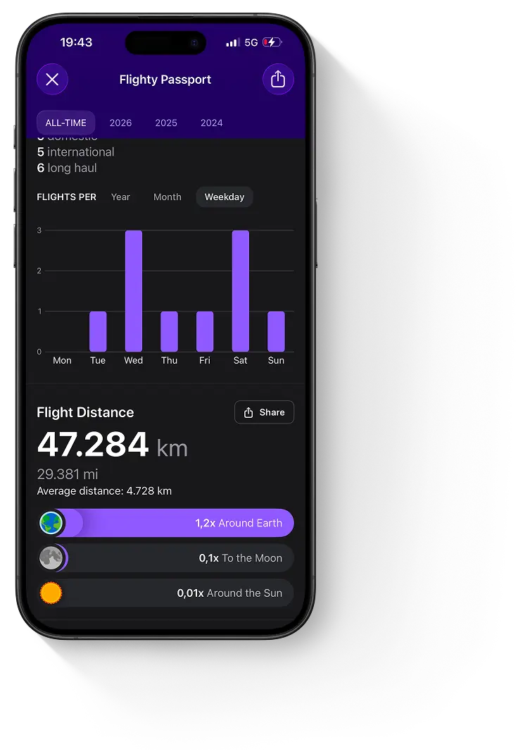 Whether you fly one time per year or one hundred, Flighty gives you a record of all the fun details about your flights. How many times have you traveled around the Earth? What was your worst delay? What's your most-flown plane? Sit back and enjoy your lifetime of flying history, all on an Apple Design Award-winning interface.